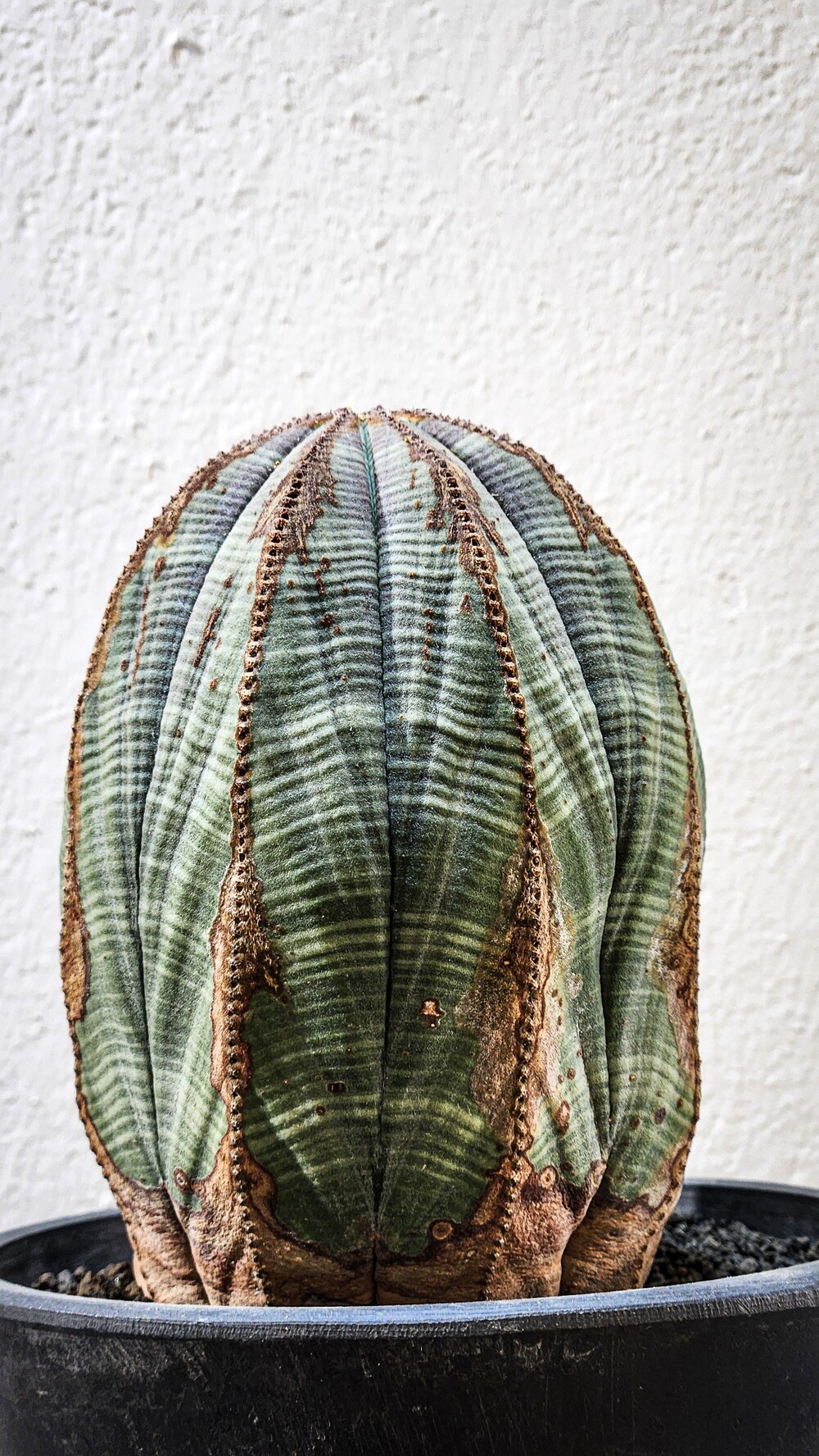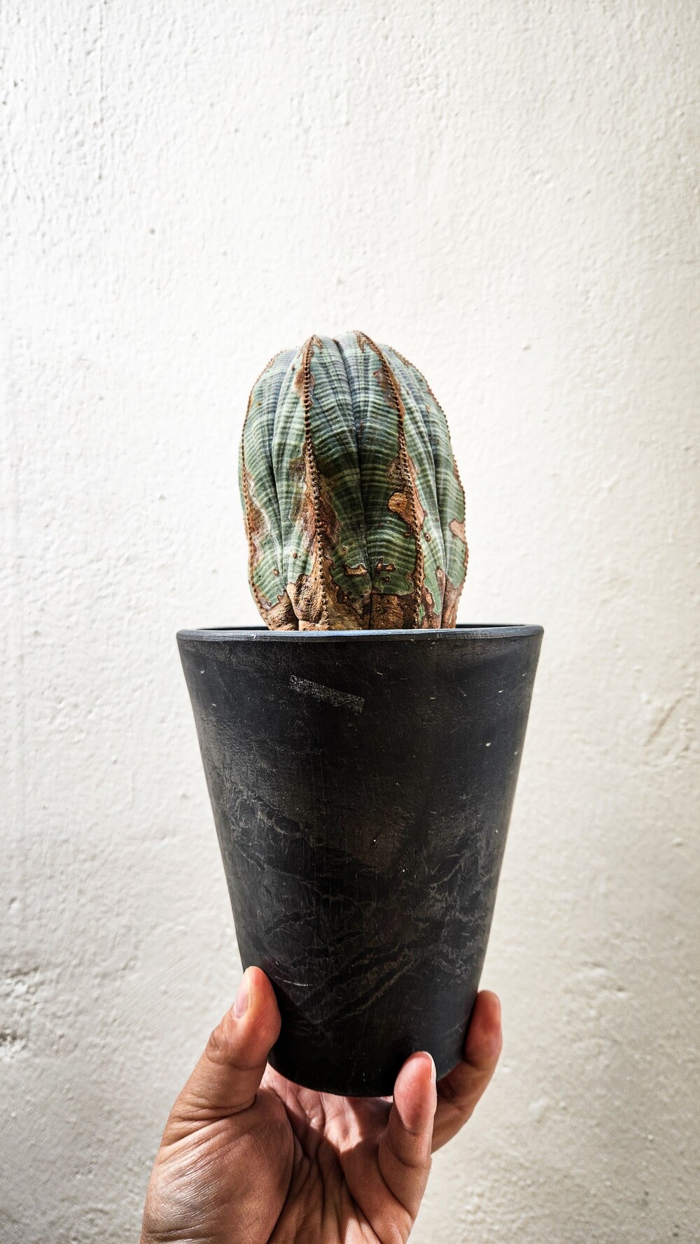 오래된 오베사(Euphorbia obesa)의 경우 하단의 목질화가 서서히 이루어지며 흰색 혹은 회색, 연갈색 등 빈티지한 묵은 느낌을 받을 수있으며, 선천적 혹은 후천적인 영향에 따라 다양한 바디의 무늬, 혹은 목질화가 이루어져 같은 종이라도 색다른 느낌을 느낄 수있는 식물입니다.