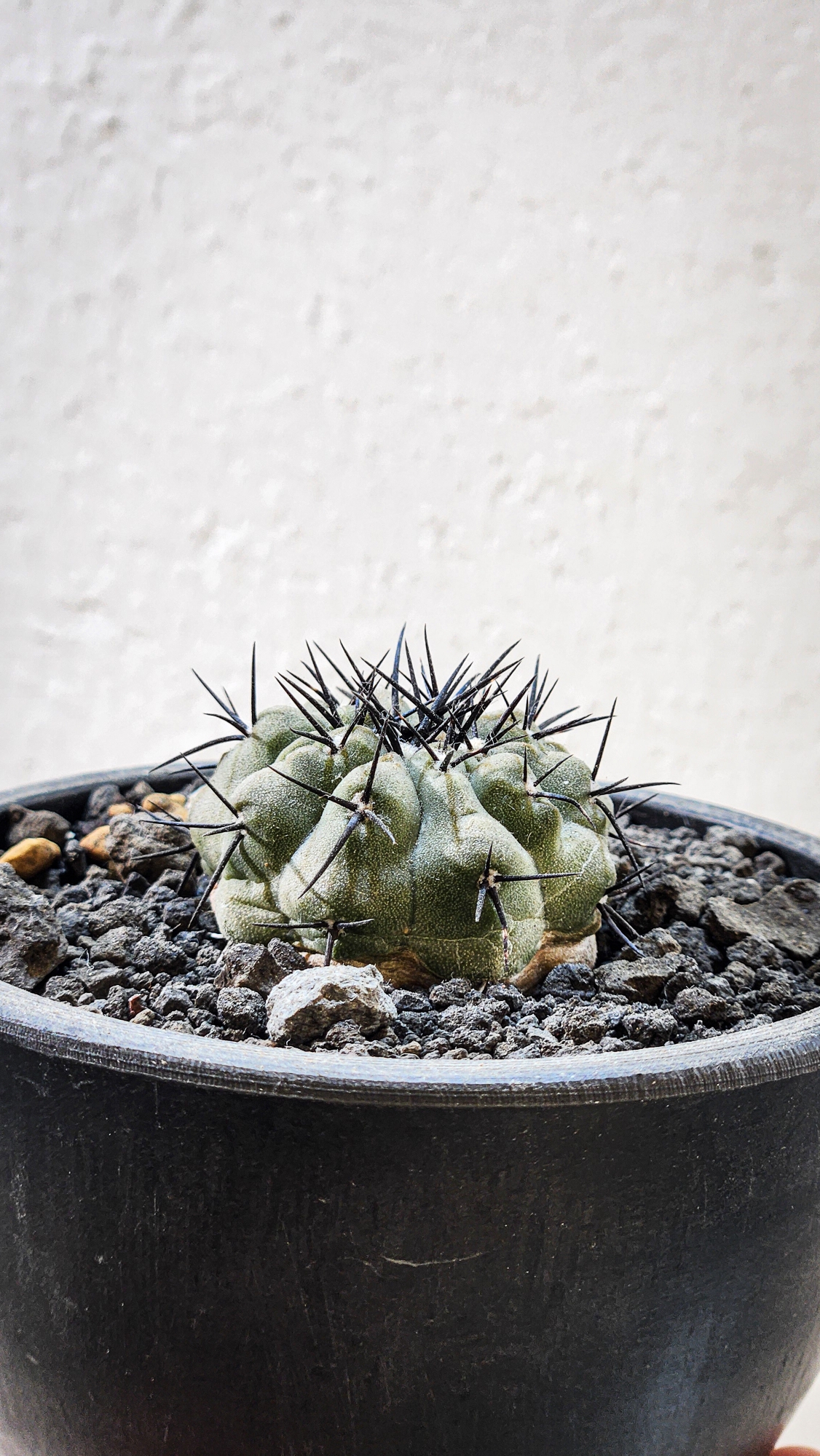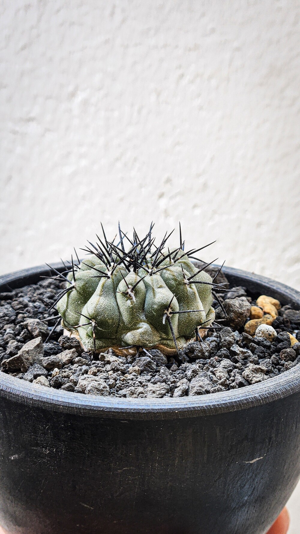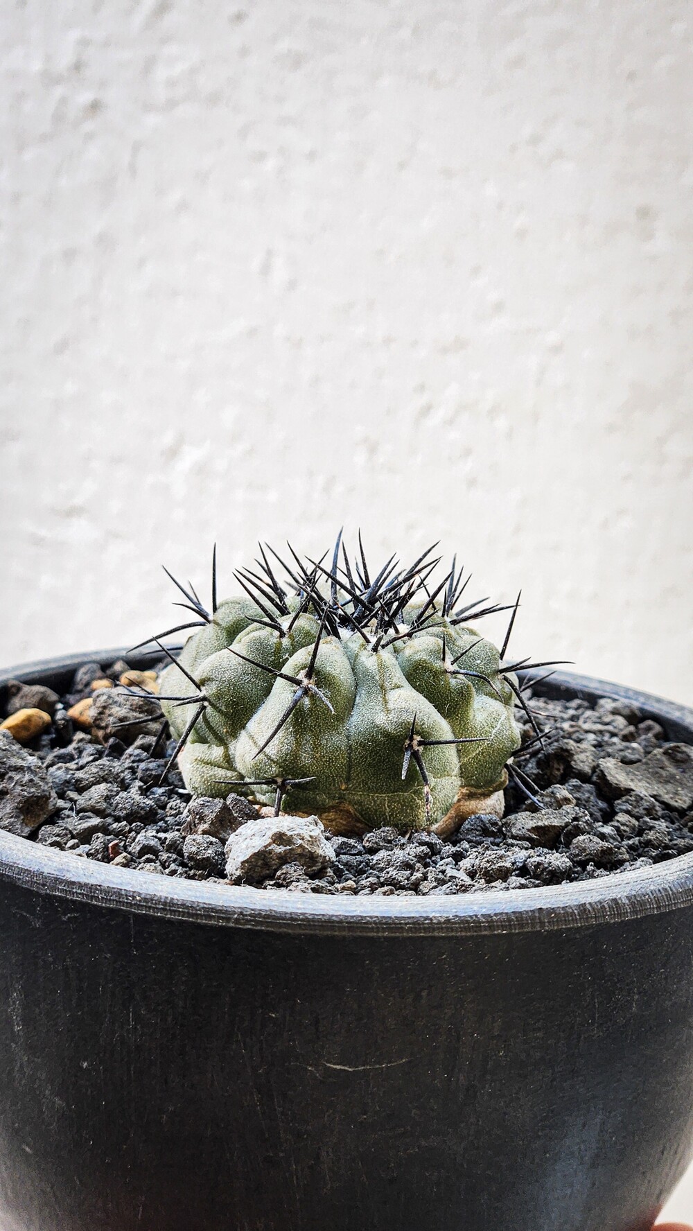 특징으로는 올록볼록한 바디와 검정색 가시, 아래로부터 서서히 목질화가 이루어지며 천천히 성장 중인 식물입니다.