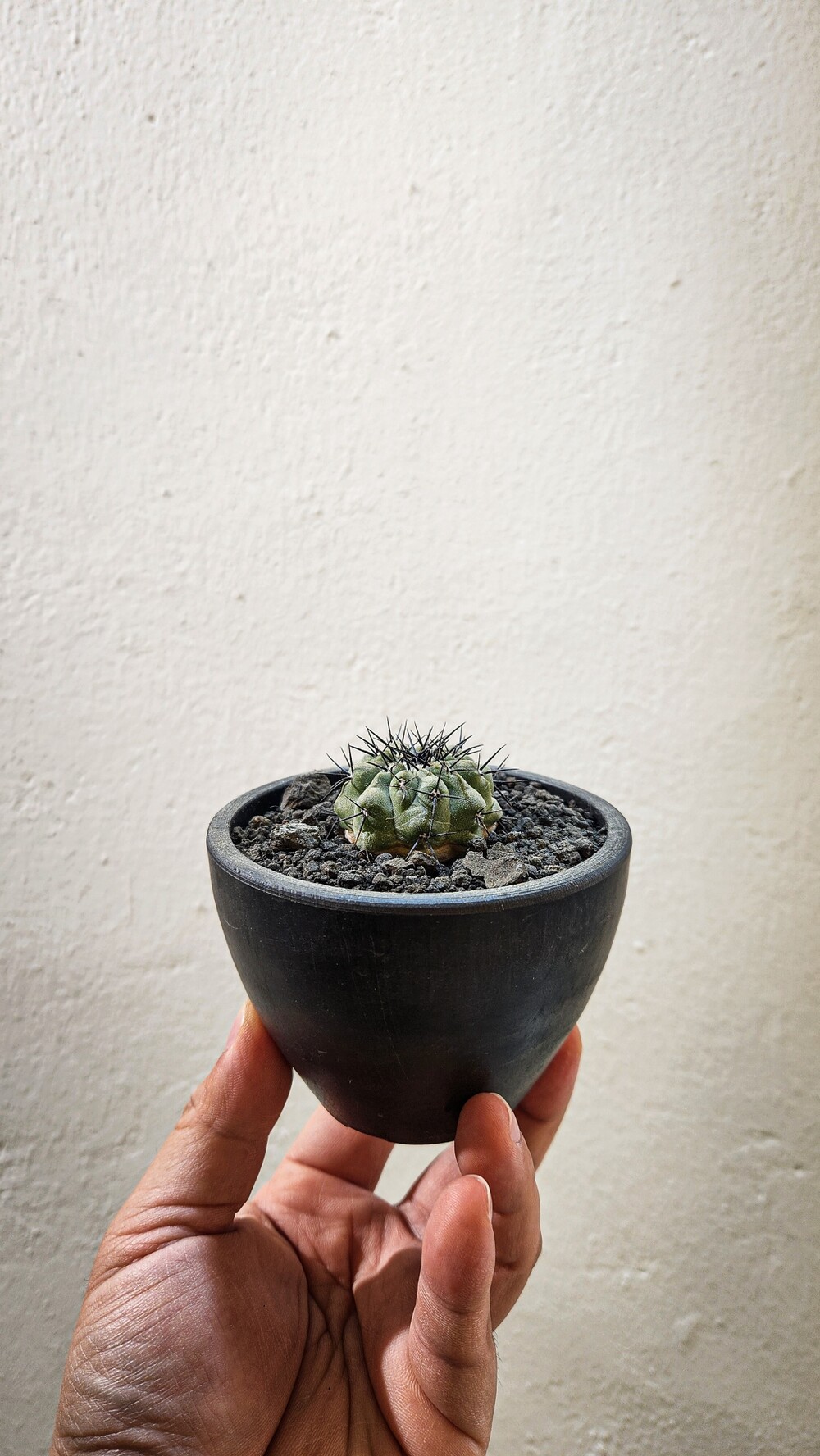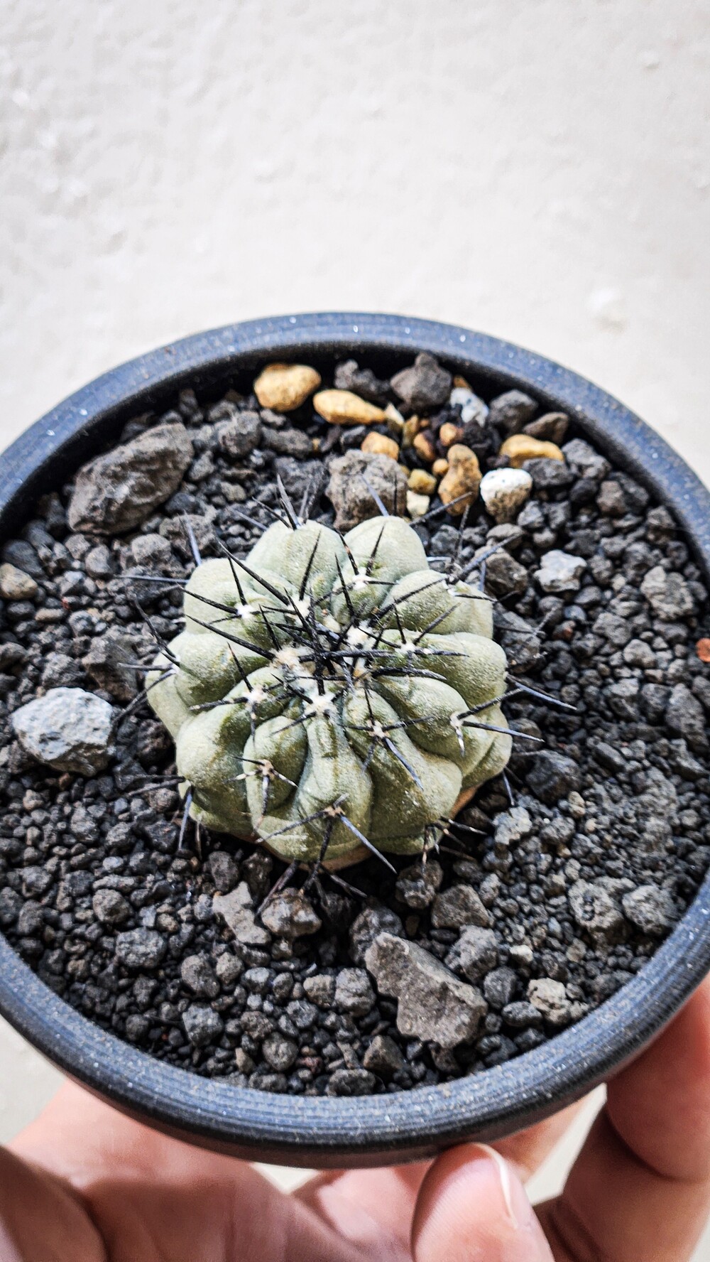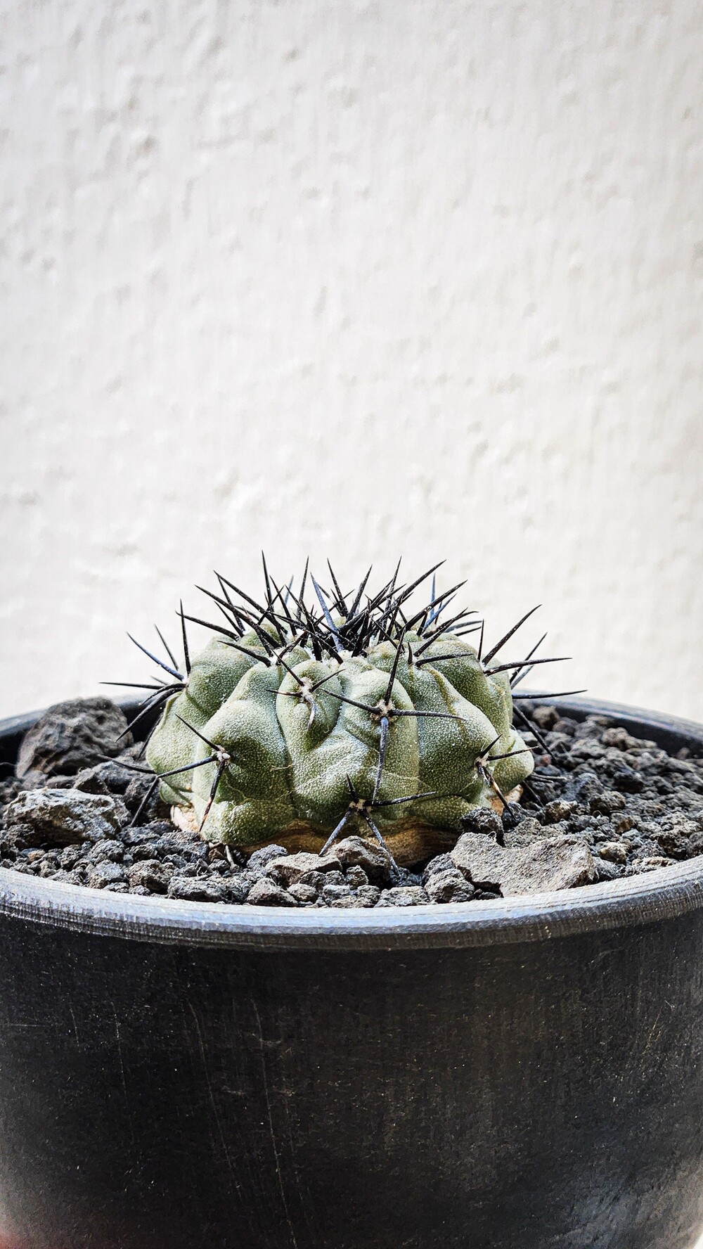 특징으로는 올록볼록한 바디와 검정색 가시, 아래로부터 서서히 목질화가 이루어지며 천천히 성장 중인 식물입니다.