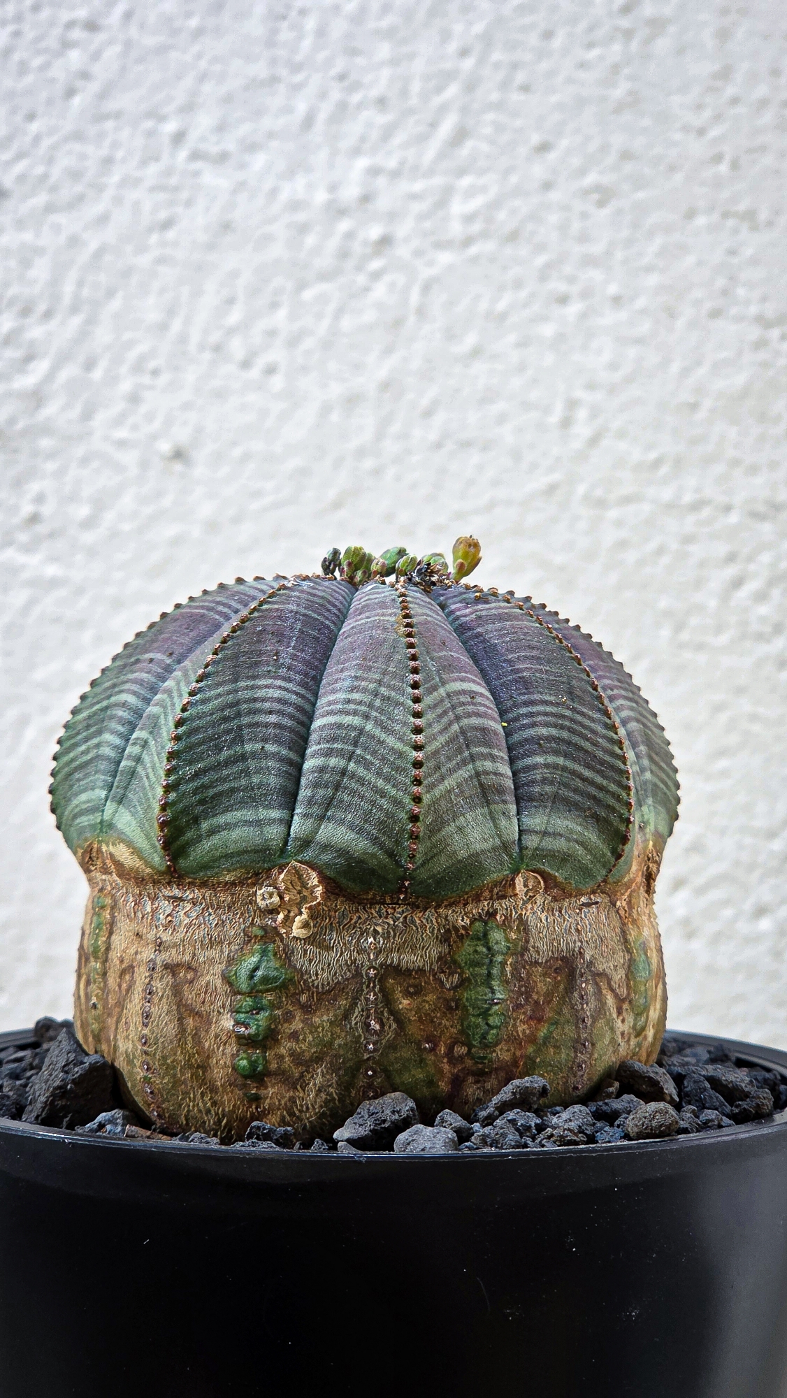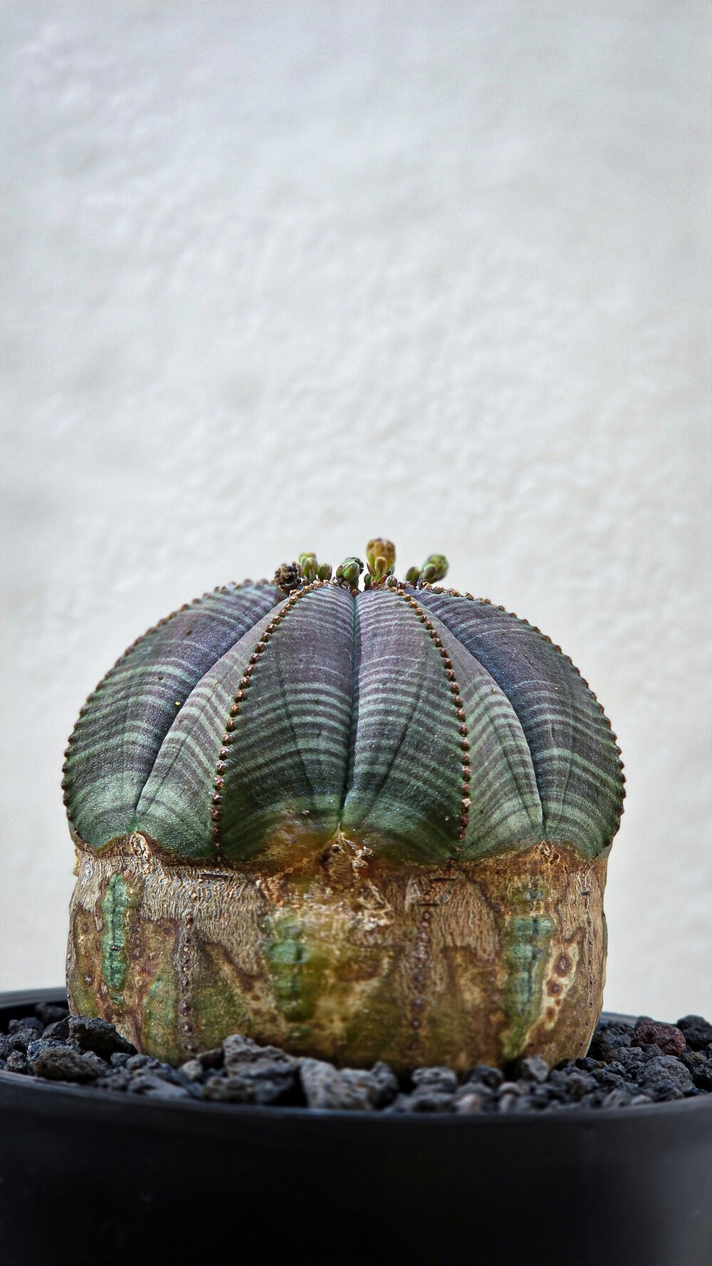 오래된 오베사(Euphorbia obesa)의 경우 하단의 목질화가 서서히 이루어지며 흰색 혹은 회색, 연갈색 등 빈티지한 묵은 느낌을 받을 수있으며, 선천적 혹은 후천적인 영향에 따라 다양한 바디의 무늬, 혹은 목질화가 이루어져 같은 종이라도 색다른 느낌을 느낄 수있는 식물입니다.