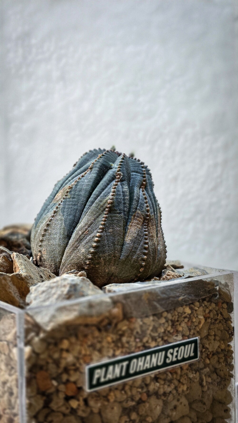오래된 오베사(Euphorbia obesa)의 경우 하단의 목질화가 서서히 이루어지며 흰색 혹은 회색, 연갈색 등 빈티지한 묵은 느낌을 받을 수있으며, 선천적 혹은 후천적인 영향에 따라 다양한 바디의 무늬, 혹은 목질화가 이루어져 같은 종이라도 색다른 느낌을 느낄 수있는 식물입니다.